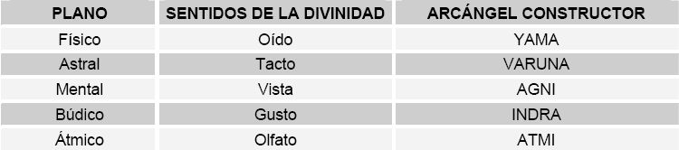 Existe una relación total entre un Arcángel, que es la energía coherente de un Plano de la Naturaleza y un Deva constructor, que es el factor coherente que construye el cuerpo expresivo de un hombre. Puede comprenderse, utilizando como siempre la analogía, que tal relación ha de hallarse en el misterio del Éter, la sustancia cósmica mediante la cual y de acuerdo a su grado de sutilidad son estructurados los distintos Planos de la Naturaleza, y dentro de estos Planos, los cuerpos correspondientes a todos los estados de conciencia humana y a todas las infinitas especies dentro de los Reinos en evolución. Hemos hablado de "factor coherente" en lo que respecta a la construcción de cualquiera de los mecanismos que el hombre utiliza en el devenir de su existencia kármica o el que utiliza la propia Divinidad en la manifestación de los Planos del Universo. Sin embargo, hay que tener en cuenta también el "factor aglutinante" que corresponde a la actividad del átomo permanente. Este consta asimismo de siete espirillas, cada cual con sus propias líneas de energía, que son la representación en la vida del átomo de los siete Planos del Universo, dotadas de un movimiento particular de contracción y dilatación a igual que un diminuto corazón reaccionando sincrónicamente a los movimientos de sístoles y diástoles del gran Corazón solar que determina el fenómeno de la Vida en el Universo. En la presente era evolutiva sólo cinco espirillas están activas dentro del átomo permanente humano, correspondiendo cada una a la evolución de un sentido físico y al posible despertar de sus contrapartes en los mundos más sutiles. Tengamos en cuenta, al respecto, que el movimiento de contracción y dilatación del minúsculo corazón del átomo permanente está regido misteriosamente por unas vidas angélicas especializadas, atraídas a este centro de vida atómica por ciertas radiaciones emitidas a través del mismo por el principio espiritual o Monádico del ser humano. El Espíritu, mediante el desarrollo de las espirillas en el átomo permanente, una para cada gran Raza en evolución, origina los sentidos de percepción o avenidas de contacto con la obra de la Naturaleza. De acuerdo con el proceso de la evolución puede ser establecido el siguiente cuadro de analogías: