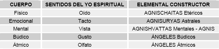 d) Un grupo de Ángeles, llamados en su totalidad devas o elementales constructores que viven, se mueven y tienen su ser en los cuatro niveles inferiores del Plano Físico, el subetérico, el gaseoso, el liquido y el sólido, cuyo cometido en esta presente Cuarta Ronda planetaria es dotar al ser humano de un vehículo físico denso de relación que cristalice en su totalidad el Karma de sus vidas pasadas. La frase crística "...por sus frutos los conoceréis", puede aplicarse por entero al cuerpo físico ya que a la apreciación corriente aparece rodeado de todas las condiciones requeridas a que un buen karma o un mal karma dio lugar. El cuerpo físico da siempre "la medida del karma" en su justa expresión y cuando se utiliza la conocida sentencia filosófica "...los ojos son los espejos del Alma", se hace una alusión directa a la evolución espiritual del Alma que se manifiesta por medio de aquel cuerpo. Éste, lo mismo que el vehículo etérico que constituye su contraparte en materia sutil o radiante, están constituidos por una increíble cantidad y diversidad de devas y elementales constructores que bajo la jurisdicción del Gran Arcángel YAMA y reconocidos esotéricamente con el nombre genérico de AGNISCHAlTAS, concurren en la expresión de las características kármicas aludidas en cada ser humano. Intervienen también en la creación de los motivos ambientales que definen el ambiente social del hombre y constituyen en su totalidad lo que en lenguaje técnico podríamos definir como el andamiaje o "estructura básica" de la evolución.